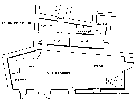 Plan du rez de chaussée : 1 cuisine de 16 m² et 1 plonge de 9 m², 1 WC. Salle à manger / salon de 63 m².